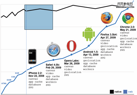 在蘋果、谷歌及微軟等巨頭公司的積極倡導(dǎo)下,HTML5技術(shù)進步神速,web app可以實現(xiàn)的效果愈來愈豐富。很多web app確實已經(jīng)可以和native app相媲美了。對HTML5支持最好的瀏覽器是Safari和Chrome,F(xiàn)irefox和 Opera差強人意,IE瀏覽器支持度最低。如下圖所示: