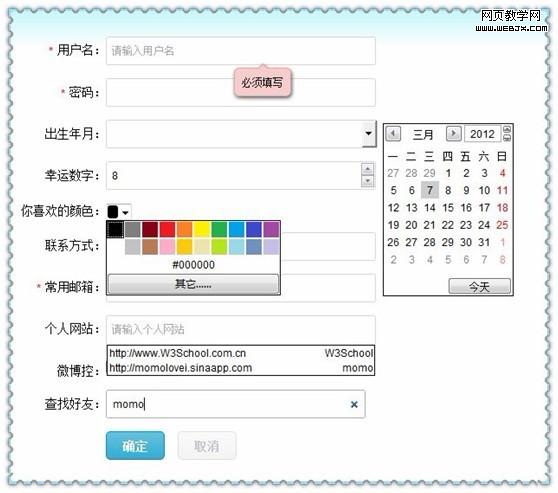 實例五是演示強大的表單,它的強大不僅體現在更多的type類型tel,email,url,search,range,number,color,datetime等更強的體現在它對應的HTML5 forms API.