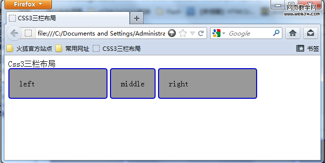 1 <!DOCTYPE HTML> 2 <html> 3 <head> 4 <meta http-equiv="Content-Type" content="text/html; charset=utf-8"> 5 <title>CSS3三欄布局</title> 6 <style> 7 .container{ 8 display:-webkit-box; 9 display:-moz-box;10 }11 div:not(.container){12 -webkit-border-radius:5px;13 -moz-border-radius:5px;14 border-radius:5px;15 background:#999;16 border:#00C 2px solid;17 }18 19 #left,#right{20 width:200px;21 -webkit-box-sizing:border-box;22 -moz-box-sizing:border-box;23 padding:20px;24 }25 #middle{26 padding:20px;27 -webkit-box-flex:1;28 -moz-box-flex:1;29 -webkit-box-ordinal-group:2;30 -moz-box-ordinal-group:2;31 margin:0 5px;32 }33 #right{34 -webkit-box-ordinal-group:2;35 -moz-box-ordinal-group:2;36 }37 </style>38 </head>39 40 <body>41 <header>42 Css3三欄布局43 </header>44 <section>45 <div class="container">46 <div id="middle">middle</div>47 <div id="left">left</div>48 <div id="right">right</div>49 </div>50 </section>51 </body>52 </html>