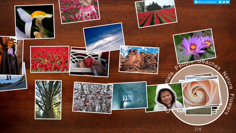 上面這幅圖展示的也是一個網站應用,通過瀏覽器訪問,基于 HTML5,在這里,您可以把照片自然地鋪開在桌子上,供您把玩和欣賞。該應用著重展示的是觸控場景,通過它,您可以用手指輕松將照片鋪開、縮放和旋轉,您可以體驗到自然人機交互帶來的樂趣。當然,照片應用只是一個例子,生活中其實還有很多可以用觸摸作為交互手段的場景,特別是網頁游戲。微軟推出的 MS Pointers API 讓您的觸控開發起于一個全新高度,Pointer 事件封裝了觸摸、數字筆和鼠標的輸入,有助于輕松構建不依賴于硬件設備的交互方式的體驗。