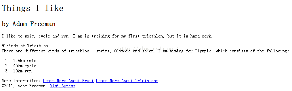 <body> <header> <hgroup> <h1>Things I like</h1> <h2>by Adam Freeman</h2> </hgroup> <address> Questions and comments?<a href="mailto:adam@myboringblog.com">Email me</a> </address> <nav> <h1>Contents</h1> <ul> <li><a href="#fruitsilike">Fruits I Like</a></li> <ul> <li><a href="#morefruit">Additional Fruits</a></li> </ul> <li><a href="#activitiesilike">Activities I Like</a></li> <ul> <li><a href="#tritypes">Kinds of Triathlon</a></li> <li><a href="#mytri">The kind of triathlon I am aiming for</a></li> </ul> </ul> </nav> </header> <main role="main"> <article> <header> ...... </header> <aside> <h1>Why Fruit is Healthy</h1> <section> Here ar three reasons why everyone should eat more fruit: <ol> <li>Fruit contains lots of vitamins</li> <li>Fruit is a source of fibre</li> <li>Fruit contains few calories</li> </ol> <section> </aside> <section> <p>I like to swim, cycle and run. I am in training for my first triathlon, but it is hard work.</p> <details> <summary>Kinds of Triathlon</summary> There are different kinds of triathlon - sprint, Olympic and so on. I am aiming for Olympic, which consists of the following: <ol> <li>1.5km swim</li> <li>40km cycle</li> <li>10km run</li> </ol> </details> </section> </article> </main> <nav> More Information: <a href="http://fruit.org">Learn More About Fruit</a> <a href="http://triathlon.org">Learn More About Triathlons</a> </nav> <footer id="mainFooter"> ©2011, Adam Freeman. <a href="http://apress.com">Visi Apress</a> </footer></body>