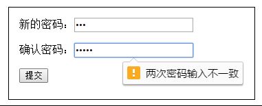 // 校驗2個密碼是否一致var validityPwd = function(){ var newPwd = document.getElementById('newPwd'); var newPwdConfirm = document.getElementById('newPwdConfirm'); if(newPwd.value != newPwdConfirm.value){ newPwdConfirm.setCustomValidity('兩次密碼輸入不一致'); }else{ newPwdConfirm.setCustomValidity(''); }}