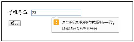 <form action="#" > <p>手機號碼:<input type="text" name="phoneNumber" pattern="[1]([3]|[5])[0-9]{9}" title="13或15開頭的手機號碼" /></p> <input type="submit" /></form>