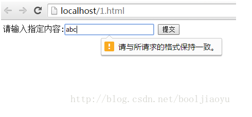 之前提到的新增的input元素,比如email,number,URL等,要求輸入內容符合一定的格式,對input元素使用pattern屬性,并且將屬性值設置為某個格式的正則表達式,在提交時會檢查其內容是否符合給定格式。當輸入的內容不符合給定格式時,則不允許提交,同時在瀏覽器中顯示信息提示文字,提交輸入的內容必須符合給定格式,代碼如下,要求輸入內容為一個數(shù)字與3個大寫字母: