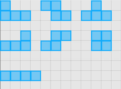 //格子 for(var i=0;i<12;i++){ for(var j=0;j<20;j++){ ctx.fillRect(i*40,j*40,40,40); ctx.strokeRect(i*40,j*40,40,40); if(this.maps[j][i]==1){//方格已經有填充內容 ctx.save(); ctx.lineWidth=4; ctx.fillStyle='hsla(200,100%,50%,.5)'; ctx.strokeStyle='hsla(200,100%,50%,.9)'; ctx.fillRect(i*40,j*40,40,40); ctx.strokeRect(i*40+2,j*40+2,38,38); ctx.restore(); } } } //邊框 ctx.lineWidth=4; ctx.strokeStyle='hsla(0,100%,0%,.3)'; ctx.moveTo(0,0); ctx.lineTo(0,20*40); ctx.lineTo(12*40,20*40); ctx.lineTo(12*40,0); ctx.stroke(); ctx.restore();