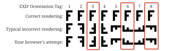 下面是 EXIF 旋轉標志位,總共有 8 種,但是通過相機拍攝時只能產生1、3、6、8 四種,分別對應相機正常、順時針旋轉180°、逆時針旋轉90°、順時針旋轉90°時所拍攝的照片。