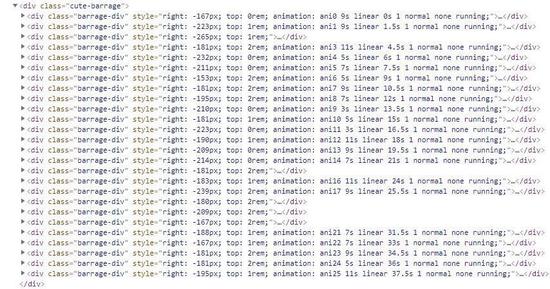 //彈幕var winWidth = $(window).width(); //獲取屏幕寬度$(".barrage-div").each(function(index,value){ //遍歷每條彈幕 var width = $(value).width(); //獲取當前彈幕的寬度 var topRandom = Math.floor(Math.random() * 3) + 'rem'; //獲取0,1,2的隨機數 可根據情況改變 $(value).css({"right":-width,"top":topRandom}); //將彈幕移動到屏幕外面,正好超出的位置 //拼寫動畫幀函數,記得每個ani要進行區分,寬度從自己的負寬度移動一整個屏幕的距離 var keyframes = `/ @keyframes ani${index}{ form{ right:${-width}px; } to{ right:${winWidth}px; } }/ @-webkit-keyframes ani${index}{ form{ right:${-width}px; } to{ right:${winWidth}px; } }`; //添加到頁面的head標簽里面 $("<style>").attr("type","text/css").html(keyframes).appendTo($("head")); //定義動畫速度列表 var aniList = [3,5,7,9,11]; //取數組的隨機數,0,1,2,3,4 var aniTime =Math.floor(Math.random() * 5); //給當全前彈幕添加animation的css //延遲的時間用每個的*1.5倍,這個可變 $(value).css({"animation":`ani${index} ${aniList[aniTime]}s linear ${index * 1.5}s`,"-webkit-animation":`ani${index} ${aniList[aniTime]}s linear ${index * 1.5}s`});})