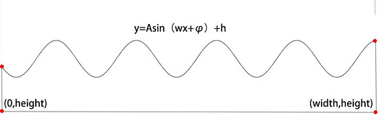 其中 A表示振幅,ω表示角頻率(ω=2π/T,T為函數的周期),φ表示初相,h表示圖像向y軸正方向平移的長度 ;(這里需要注意一下:h在數學學的本來是表示向上平移的,但在canvas中采用的是屏幕坐標系,即左上角為原點,h則表示向下平移);