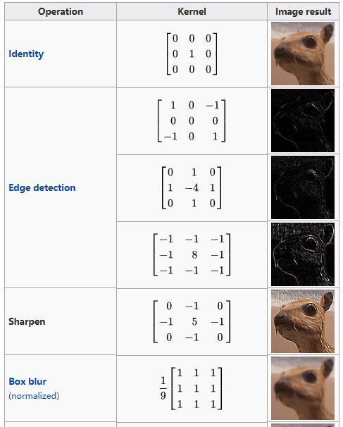 圖像歸根到底就是一大堆的顏色點矩陣,我們完全可以把顏色點代替上面的數字矩陣處理,不同的卷積核對圖片的處理結果如下(圖片來自維基百科)