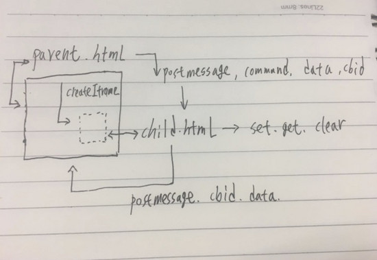懶得拿工具畫圖了,因為流程比較清晰,這里拿文字復(fù)述一下整個通訊流程,首先父頁面創(chuàng)建一個隱藏的iframe,然后當(dāng)執(zhí)行set,get,clear等command的時候,通過postMessage來進行消息廣播,子頁面接收到消息后,解析命令,數(shù)據(jù)和回調(diào)id(postMessage無法傳遞函數(shù)和引用,兼容問題導(dǎo)致,最好只傳string類型,所以還需要對data做stringify)。然后當(dāng)子頁面處理完localstorage的操作后,再通過postMessage把對應(yīng)的cbid和data返回給父頁面,父頁面監(jiān)聽message事件,處理結(jié)果。
