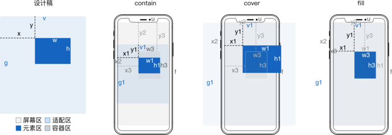 設計稿 寬 v 高 g 適配前元素 橫坐標 x 縱坐標 y 寬 w 高 h適配后容器 橫坐標 x3 = x*u/v 縱坐標 y3 = y*f/g適配后元素 橫坐標 x4 = m*u + (x - m*v)/w*w1 = m*v/w*w3 + (x - m*v)/w*w1 縱坐標 y4 = n*f + (y - n*g)/h*h1 = n*g/h*h3 + (y - n*g)/h*h1 寬 w3 = (w/v)*u 高 h3 = (h/g)*f 當 contain 方式適配時 縮放值 s = Math.min(f/g, u/v) 橫向左留白占總留白 o = (m*v - x)/w 縱向上留白占總留白 p = (n*g - y)/h 當 cover 方式適配時 縮放值 s = Math.max(f/g, u/v) 橫向左超出占總超出 o = (x - m*v)/w 縱向上超出占總超出 p = (y - n*g)/h適配區 垂直居頂時 m = 0 垂直居中時 m = .5 垂直居底時 m = 1 水平居左時 n = 0 水平居中時 n = .5 水平居右時 n = 1 相比整層適配內存優化 (w3*h3)/(v1*g1) >= w*h/(v*g)