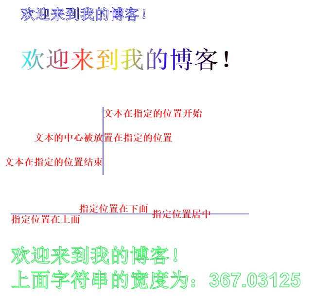var canvas = document.getElementById("canvas"); var context = canvas.getContext("2d"); context.font="bold 30px Arial"; //設(shè)置樣式 context.strokeStyle = "#1712F4"; context.strokeText("歡迎來到我的博客!",30,100); context.font="bold 50px Arial"; var grd = context.createLinearGradient( 30 , 200, 400 , 300 );//設(shè)置漸變填充樣式 grd.addColorStop(0,"#1EF9F7"); grd.addColorStop(0.25,"#FC0F31"); grd.addColorStop(0.5,"#ECF811"); grd.addColorStop(0.75,"#2F0AF1"); grd.addColorStop(1,"#160303"); context.fillStyle = grd; context.fillText("歡迎來到我的博客!",30,200); context.save(); context.moveTo(200,280); context.lineTo(200,420); context.stroke(); context.font="bold 20px Arial"; context.fillStyle = "#F80707"; context.textAlign="left"; context.fillText("文本在指定的位置開始",200,300); context.textAlign="center"; context.fillText("文本的中心被放置在指定的位置",200,350); context.textAlign="right"; context.fillText("文本在指定的位置結(jié)束",200,400); context.restore(); context.save(); context.moveTo(10,500); context.lineTo(500,500); context.stroke(); context.fillStyle="#F60D0D"; context.font="bold 20px Arial"; context.textBaseline="top"; context.fillText("指定位置在上面",10,500); context.textBaseline="bottom"; context.fillText("指定位置在下面",150,500); context.textBaseline="middle"; context.fillText("指定位置居中",300,500); context.restore(); context.font="bold 40px Arial"; context.strokeStyle = "#16F643"; var text = "歡迎來到我的博客!"; context.strokeText("歡迎來到我的博客!",10,600); context.strokeText("上面字符串的寬度為:"+context.measureText(text).width,10,650);