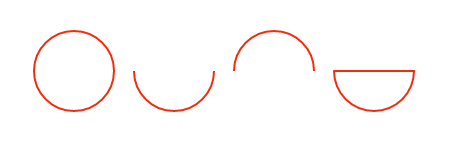 var canvas = document.getElementById("canvas"); var context = canvas.getContext("2d"); context.strokeStyle = "#F22D0D"; context.lineWidth = "2"; //繪制圓 context.beginPath(); context.arc(100,100,40,0,2*Math.PI); context.stroke(); //繪制半圓 context.beginPath(); context.arc(200,100,40,0,Math.PI); context.stroke(); //繪制半圓,逆時(shí)針 context.beginPath(); context.arc(300,100,40,0,Math.PI,true); context.stroke(); //繪制封閉半圓 context.beginPath(); context.arc(400,100,40,0,Math.PI); context.closePath(); context.stroke();