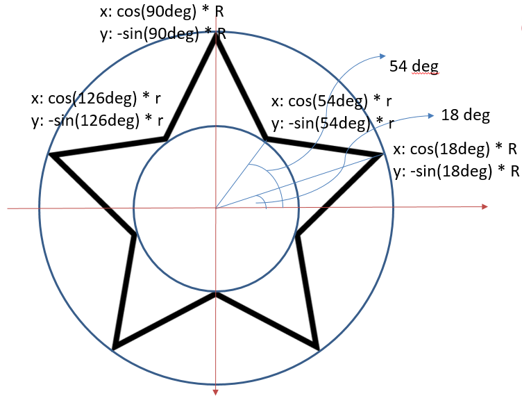 通過對五角星分析,我們可以確定各個(gè)頂點(diǎn)坐標(biāo)的規(guī)律,這里需要注意的一點(diǎn)是:在canvas中,Y軸的方向是向下的。