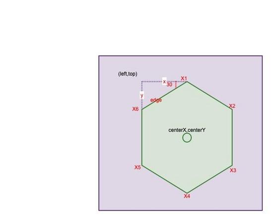 如上圖,繪制一個六邊形有以下幾個關鍵點:
