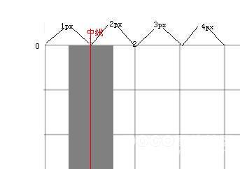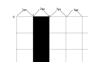 但遺憾的是canvas的線條畫法不一樣,上一篇文章我們已經說了,canvas的每條線都有一條無限細的“中線”,線條的寬度是從中線向兩側延伸的。如果我們還是從第2個像素點畫一條線,那么線條的中線就會靠齊到第2個像素的起點,然后我們開始畫了,問題也就來了:Canvas 的線條以中線向兩側延伸,而不是向某一邊延伸(比如這里,如果只是往右側延伸,那么我們的問題就不再是問題了),延伸過后我們的線條實際上是這樣的: