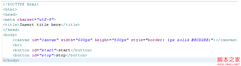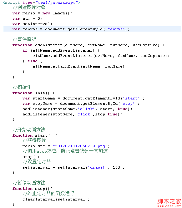 2.新建一個html5文件,此處命名為mario.html,定義canvas元素,開始動畫start按鈕,暫停動畫stop按鈕