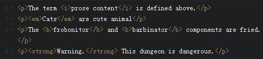 // 分類學(xué)名稱<p>The <i class="taxonomy">Felis silvestris catus</i> is cute.</p>// 術(shù)語(yǔ)<p>The term <i>prose content</i> is defined above.</p>// 外語(yǔ)習(xí)語(yǔ)<p>There is a certain <i lang="fr">je ne sais quoi</i> in the air.</p>