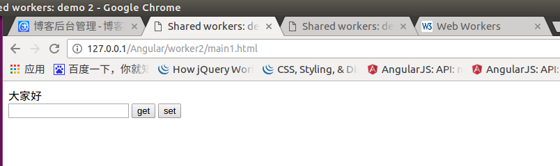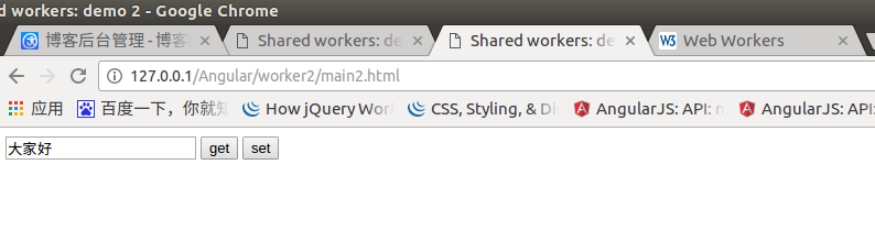 //main1 和main2都是這樣<!DOCTYPE HTML><html><head> <title>Shared workers: demo 2</title></head><body><div id="log"></div><input type="text" name="" id="txt"><button id="get">get</button><button id="set">set</button><script> var worker = new SharedWorker('shared.js'); var get = document.getElementById('get'); var set = document.getElementById('set'); var txt = document.getElementById('txt'); var log = document.getElementById('log'); worker.port.addEventListener('message', function(e) { log.innerText = e.data; }, false); worker.port.start(); // note: need this when using addEventListener set.addEventListener('click',function(e){ worker.port.postMessage(txt.value); },false); get.addEventListener('click',function(e){ worker.port.postMessage('get'); },false);</script></body></html>//sharedvar data;onconnect = function(e) { var port = e.ports[0]; port.onmessage = function(e) { if(e.data=='get'){ port.postMessage(data); }else{ data=e.data; } }}