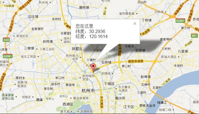locationSuccess: function(position){ var coords = position.coords; var latlng = new google.maps.LatLng( // 維度 coords.latitude, // 精度 coords.longitude ); var myOptions = { // 地圖放大倍數 zoom: 12, // 地圖中心設為指定坐標點 center: latlng, // 地圖類型 mapTypeId: google.maps.MapTypeId.ROADMAP }; // 創建地圖并輸出到頁面 var myMap = new google.maps.Map( document.getElementById("map"),myOptions ); // 創建標記 var marker = new google.maps.Marker({ // 標注指定的經緯度坐標點 position: latlng, // 指定用于標注的地圖 map: myMap }); //創建標注窗口 var infowindow = new google.maps.InfoWindow({ content:"您在這里<br/>緯度:"+ coords.latitude+ "<br/>經度:"+coords.longitude }); //打開標注窗口 infowindow.open(myMap,marker); }