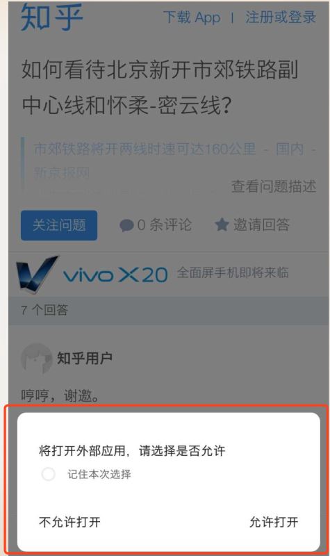 他的邏輯是先提示我是否打開手機中的知乎APP(瀏覽器的機制詢問用戶操作許可),然后接著又彈出下載的提示。