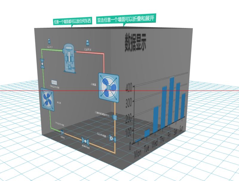 這個時候我不能把pumpGV和g3d都加到底層div上,并且我的意圖是把pumpGV加到g3d中的CSGBox中的一面上,所以為了讓pumpGV顯示出來 必須設(shè)置pumpGV的寬高,而這個寬高必須比我json畫出來的圖占的面積要大,不然顯示不完整。如果想看這個寬高對顯示的影響,可以自己改改看來玩玩。
