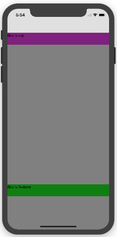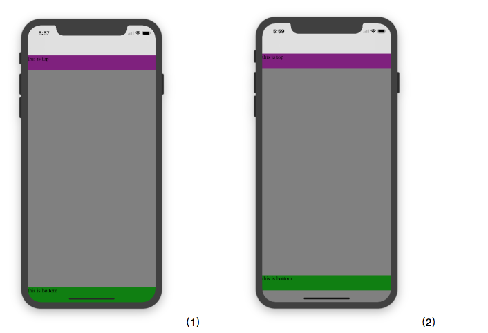 <!DOCTYPE html><html><head> <meta name="viewport" content="initial-scale=1"> <!--<meta name="viewport" content="initial-scale=1, viewport-fit=cover">--> <title>Designing Websites for iPhone X: Respecting the safe areas</title> <style> * { padding: 0; margin: 0; } /*html,body {*/ /*height: 100%;*/ /*}*/ body { background: grey; /*padding-top: constant(safe-area-inset-top);*/ /*padding-left: constant(safe-area-inset-left);*/ /*padding-right: constant(safe-area-inset-right);*/ /*padding-bottom: constant(safe-area-inset-bottom);*/ } .top { width: 100%; height: 44px; background: purple; } .bottom { position: fixed; bottom: 0; left: 0; right: 0; height: 44px; color: black; background: green; } </style></head><body> <div class="top">this is top</div> <div class="bottom">this is bottom</div></body></html>