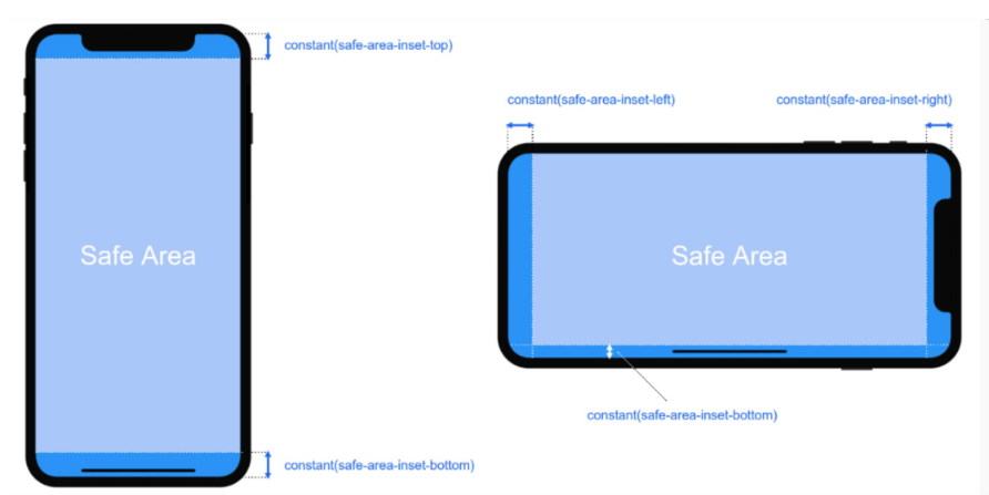 * { padding: 0; margin: 0; } html,body { height: 100%; } body { background: grey; padding-top: constant(safe-area-inset-top); padding-left: constant(safe-area-inset-left); padding-right: constant(safe-area-inset-right); padding-bottom: constant(safe-area-inset-bottom); } .top { width: 100%; height: 44px; background: purple; } .bottom { position: fixed; bottom: 0; left: 0; right: 0; height: 44px; color: black; background: green; }