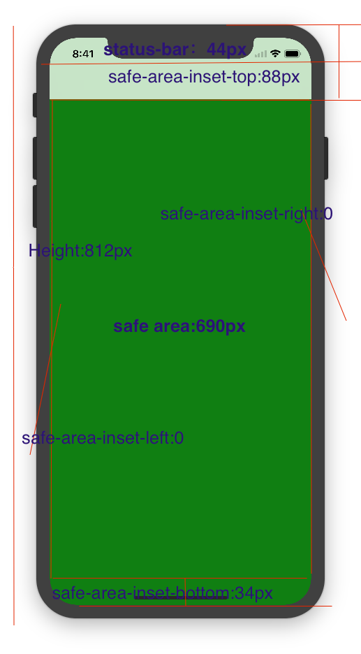 * { padding: 0; margin: 0; } body { background:green; padding-top: constant(safe-area-inset-top); //88px /*padding-left: constant(safe-area-inset-left);*/ /*padding-right: constant(safe-area-inset-right);*/ /*padding-bottom: constant(safe-area-inset-bottom);*/ }