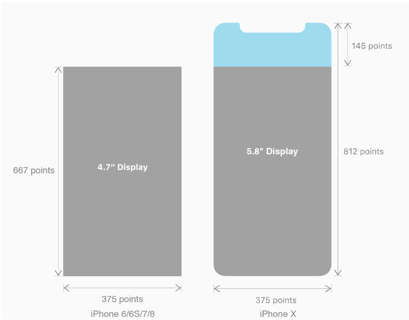 然而iPhone X 無論是在屏幕尺寸、分辨率、甚至是形狀上都發生了較大的改變,下面以iPhone 8作為參照物,看看到底iPhone X的適配我們要怎么考慮。