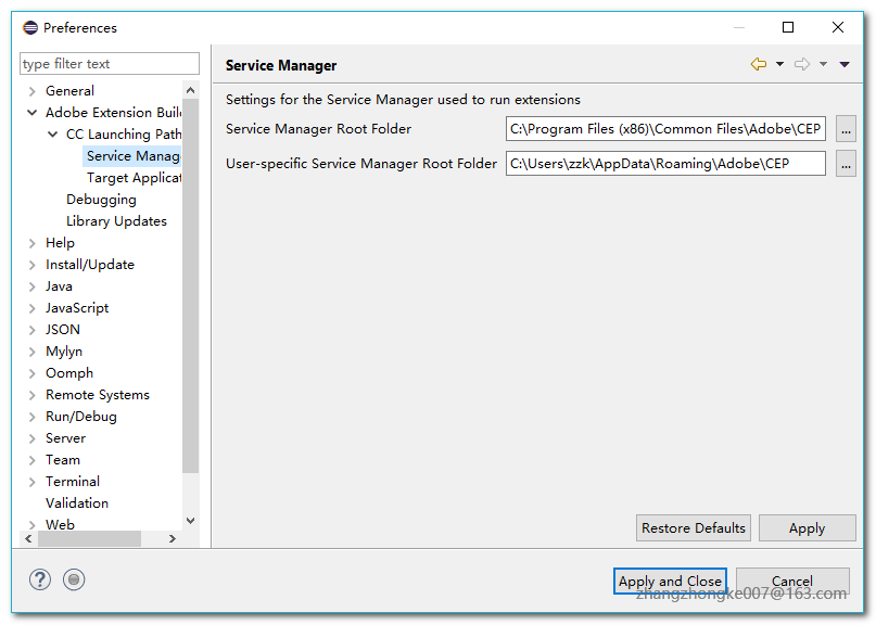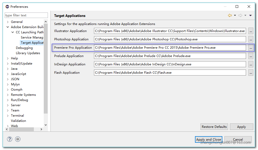 安裝Adobe Premiere Pro CC 2014/2015.配置elicpse的“target application”和"Service Manager"