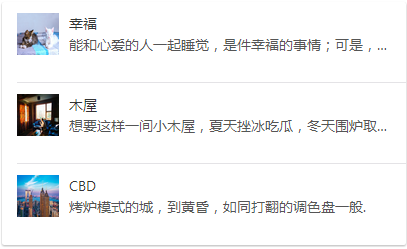 <ul class="mui-table-view"> <li class="mui-table-view-cell mui-media"> <a href="javascript:;"> <img class="mui-media-object mui-pull-left" src="img/a.jpg"> <div class="mui-media-body"> 幸福 <p class='mui-ellipsis'>能和心愛的人一起睡覺,是件幸福的事情;可是,打呼嚕怎么辦?</p> </div> </a> </li> <li class="mui-table-view-cell mui-media"> <a href="javascript:;"> <img class="mui-media-object mui-pull-left" src="img/b.jpg"> <div class="mui-media-body"> 木屋 <p class='mui-ellipsis'>想要這樣一間小木屋,夏天挫冰吃瓜,冬天圍爐取暖.</p> </div> </a> </li> <li class="mui-table-view-cell mui-media"> <a href="javascript:;"> <img class="mui-media-object mui-pull-left" src="img/c.jpg"> <div class="mui-media-body"> CBD <p class='mui-ellipsis'>烤爐模式的城,到黃昏,如同打翻的調(diào)色盤一般.</p> </div> </a> </li></ul>