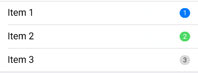 <ul class="mui-table-view"> <li class="mui-table-view-cell">Item 1 <span class="mui-badge mui-badge-primary">1</span> </li> <li class="mui-table-view-cell">Item 2 <span class="mui-badge mui-badge-success">2</span> </li> <li class="mui-table-view-cell">Item 3 <span class="mui-badge">3</span> </li></ul>