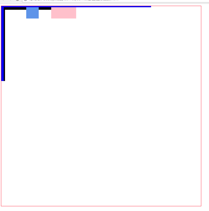 <!DOCTYPE html><html> <head> <meta charset="UTF-8"> <title></title> <style type="text/css"> canvas{ border:1px solid red; } </style> </head> <body> <canvas id="mycanvas" width="800" height="800"></canvas> </body> <script type="text/javascript"> var canvas = document.getElementById("mycanvas"); var context = canvas.getContext("2d"); //用黑色直線線表示開始的坐標系 context.beginPath(); context.moveTo(0,0); context.lineWidth = 30; context.lineTo(100,0); context.stroke(); context.beginPath(); context.moveTo(0,0); context.lineWidth = 30; context.lineTo(0,100); context.stroke(); //原圖:藍色 context.beginPath(); context.fillStyle = "cornflowerblue"; context.fillRect(100,0,50,50); context.fill(); //縮放:粉色 ,放大/小坐標系,圖形大小也縮放 context.scale(2,1); //第一個參數是X軸縮放比例,第二個參數是Y軸縮放比例 context.beginPath(); context.fillStyle = "pink"; context.fillRect(100,0,50,50); //用藍色直線表示平移以后的坐標軸 context.beginPath(); context.moveTo(0,0); context.lineWidth = 10; context.strokeStyle = "blue"; context.lineTo(100,0); context.stroke(); context.beginPath(); context.moveTo(0,0); context.lineWidth = 10; context.strokeStyle = "blue"; context.lineTo(0,100); context.stroke(); </script></html>