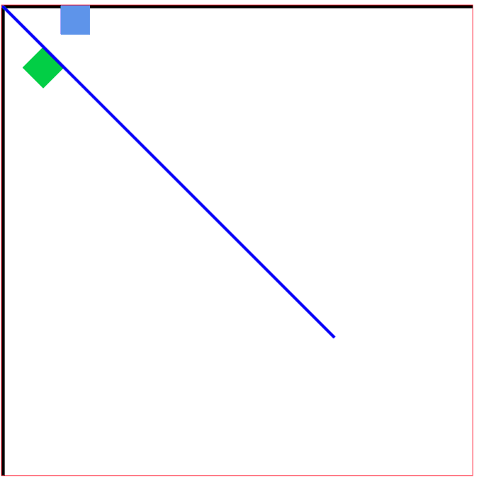 <!DOCTYPE html><html> <head> <meta charset="UTF-8"> <title></title> <style type="text/css"> canvas{ border:1px solid red; } </style> </head> <body> <canvas id="mycanvas" width="800" height="800"></canvas> </body> <script type="text/javascript"> var canvas = document.getElementById("mycanvas"); var context = canvas.getContext("2d"); //用黑色直線表示平移以后的坐標軸 context.beginPath(); context.moveTo(0,0); context.lineWidth = 10; context.lineTo(800,0); context.stroke(); context.beginPath(); context.moveTo(0,0); context.lineWidth = 10; context.lineTo(0,800); context.stroke(); //原圖:藍色 context.beginPath(); context.fillStyle = "cornflowerblue"; context.fillRect(100,0,50,50); context.fill(); //旋轉:綠色 context.beginPath(); context.fillStyle = "limegreen"; context.rotate(Math.PI/4); context.fillRect(100,0,50,50); //用藍色直線表示平移以后的坐標軸 context.beginPath(); context.moveTo(0,0); context.lineWidth = 5; context.strokeStyle = "blue"; context.lineTo(800,0); context.stroke(); context.beginPath(); context.moveTo(0,0); context.lineWidth = 5; context.strokeStyle = "blue"; context.lineTo(0,800); context.stroke(); </script></html>