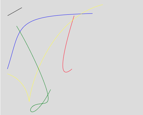 /** * canvas canvas的dom對象 * bezierCtrlNodesArr 控制點數(shù)組,包含x,y坐標 * color 曲線顏色 */var canvas = document.getElementById('canvas')//3階之前采用原生方法實現(xiàn)var arr0 = [{x:70,y:25},{x:24,y:51}]var arr1 = [{x:233,y:225},{x:170,y:279},{x:240,y:51}]var arr2 = [{x:23,y:225},{x:70,y:79},{x:40,y:51},{x:300, y:44}]var arr3 = [{x:333,y:15},{x:70,y:79},{x:40,y:551},{x:170,y:279},{x:17,y:239}]var arr4 = [{x:53,y:85},{x:170,y:279},{x:240,y:551},{x:70,y:79},{x:40,y:551},{x:170,y:279}]var bezier0 = new BezierMaker(canvas, arr0, 'black')var bezier1 = new BezierMaker(canvas, arr1, 'red')var bezier2 = new BezierMaker(canvas, arr2, 'blue')var bezier3 = new BezierMaker(canvas, arr3, 'yellow')var bezier4 = new BezierMaker(canvas, arr4, 'green')bezier0.drawBezier()bezier1.drawBezier()bezier2.drawBezier()bezier3.drawBezier()bezier4.drawBezier()