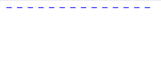 var context=document.getElementById("canvas").getContext("2d");function drawDashedLine(context,x1,y1,x2,y2,dashlength){ dashlength=dashlength===undefined?5:dashlength; var deltaX=x2-x1; //一條直角邊的長 var deltay=y2-y1; //另一條指教邊的長 var numDashes=Math.floor( Math.sqrt(deltaX*deltaX+deltay*deltay)/dashlength //Math.sqrt返回一個數的平方根 dashlength虛線每個點的長度 ) var everydashLength_x=deltaX/numDashes //確定X軸每條虛線點的起始點 var everydashLength_y=deltay/numDashes //確定Y軸每條虛線點的起始點 for(var i=0;i<numDashes;i++){ context[i%2===0?'moveTo':"lineTo"] (x1+everydashLength_x*i,y1+everydashLength_y*i) } context.stroke()}context.lineWidth=3context.strokeStyle="blue"drawDashedLine(context,20,20,context.canvas.width-20,20,20)