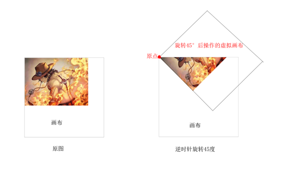 從圖可以看出,要想實(shí)現(xiàn)圍繞圖片中心旋轉(zhuǎn)45°,就得把canvas的原點(diǎn)移動(dòng)到這張圖的中心,再旋轉(zhuǎn)canvas,再就是插入圖片時(shí)將圖片往左上角平移圖片自身的一半。