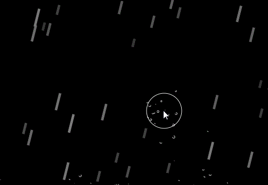 <!doctype html><html lang="en"><head> <meta charset="UTF-8"> <style> * { margin: 0; padding: 0; } </style></head><body> <canvas id="canvas" style="position: absolute; height: 100%; width:100%;"></canvas> <script> window.onload = main; function main() { // 獲取canvas元素 var canvasEl = document.getElementById('canvas'); var ctx = canvasEl.getContext('2d'); // canvas畫布的 背景顏色 var backgroundColor = '#000'; // canvas畫布的寬 等于 可視區域的寬 canvasEl.width = canvasEl.clientWidth; // canvas畫布的高 等于 可視區域的高 canvasEl.height = canvasEl.clientHeight; // 保存小水珠的數組 // 雨滴下落后散成小水珠,小水珠就是一些圓弧 var dropList = []; // 重力 // 雨滴下落后散成小水珠,小水珠會先上升后下降,主要是因為 gravity 這個變量的緣故 var gravity = 0.5; // 保存雨滴的數組 // 每個雨滴 都是 畫的一條線 var linelist = []; // 保存鼠標的坐標 // mousePos[0] 代表x軸的值,mousePos[1] 代表y軸的值 var mousePos = [0, 0]; // 跟隨鼠標, mouseDis 大小區域內的雨滴會消失,形成散落效果 // 以mousePos為圓心,mouseDis為半徑,這個范圍內的雨滴 都會散開,形成許多小水珠 var mouseDis = 35; // 更新一次動畫,畫lineNum 條雨滴,lineNum 值越大,下雨就越密集 var lineNum = 3; // 跟隨鼠標方向 變化下雨方向的 速度 // 鼠標移動后,下雨的方向 會慢慢改變,主要靠speedx 這個變量 var speedx = 0; // maxspeedx 為 speedx 可以取的最大值 // 當 speedx = maxspeedx時,下雨方向 會 隨鼠標移動方向立即改變 var maxspeedx = 0; // 頁面大小發生變化時,重置canvas畫布大小 window.onresize = function () { canvasEl.width = canvasEl.clientWidth; canvasEl.height = canvasEl.clientHeight; } //移動鼠標觸發事件 window.onmousemove = function (e) { // 設置mousePos 等于 鼠標坐標 // e.clientX 為距離 瀏覽器窗口可視區域 左邊的距離 // e.clientY 為距離 瀏覽器窗口可視區域 上邊的距離 mousePos[0] = e.clientX; mousePos[1] = e.clientY; // 通過鼠標位置,設置 maxspeedx的值,取值范圍是 -1 到 1 // maxspeedx的值,關系到 // 1、雨滴的方向 // 2、雨滴下落的方向 // 3、雨滴下落方向 跟隨 鼠標移動方向變化的速度 // 4、小水珠的移動方向 // 值越接近1,表示方向越向右 // 值越接近-1,表示方向越向左 maxspeedx = (e.clientX - canvasEl.clientWidth / 2) / (canvasEl.clientWidth / 2); } // 根據參數,返回一個rgb顏色,用于給雨滴設置顏色 function getRgb(r, g, b) { return "rgb(" + r + "," + g + "," + b + ")"; } // 畫 一滴雨(一條線) function createLine(e) { // 隨機生成 雨滴的長度 var temp = 0.25 * (50 + Math.random() * 100); // 一個 line 對象,代表一個雨滴 var line = { // 雨滴下落速度 speed: 5.5 * (Math.random() * 6 + 3), // 判斷是否刪除,值為true就刪除 die: false, // 雨滴x坐標 posx: e, // 雨滴y坐標 posy: -50, // 雨滴的長度 h: temp, // 雨滴的顏色 color: getRgb(Math.floor(temp * 255 / 75), Math.floor(temp * 255 / 75), Math.floor(temp * 255 / 75)) }; // 把創建好的line(雨滴)對象,添加到保存雨滴的數組 linelist.push(line); } // 畫一個小水珠(雨滴散開后的小水珠就是一個個的圓弧) function createDrop(x, y) { // 一個 drop 對象,代表一個圓弧 var drop = { // 判斷是否刪除,值為true就刪除 die: false, // 圓弧圓心的x坐標 posx: x, // 圓弧圓心的y坐標 posy: y, // vx 表示 x軸的值 變化的速度 vx: (Math.random() - 0.5) * 8, // vy 表示 y軸的值 變化的速度 取值范圍:-3 到 -9 vy: Math.random() * (-6) - 3, // 圓弧的半徑 radius: Math.random() * 1.5 + 1 }; return drop; } // 畫一定數量的小水珠 function madedrops(x, y) { // 隨機生成一個數 maxi // maxi 代表要畫小水珠的數量 var maxi = Math.floor(Math.random() * 5 + 5); for (var i = 0; i < maxi; i++) { dropList.push(createDrop(x, y)); } } // 開始調用update函數,更新動畫 window.requestAnimationFrame(update); // 更新動畫 function update() { // 如果保存小水珠的數組有內容 if (dropList.length > 0) { // 遍歷保存小水珠的數組 dropList.forEach(function (e) { //設置e.vx,vx表示x坐標變化的速度 // (speedx)/2 是為了,讓小水珠 在x軸的移動距離短一點,看上去更真實點 // 也使 小水珠的移動方向 和 雨滴方向,雨滴下落方向,鼠標移動方向相同 e.vx = e.vx + (speedx / 2); e.posx = e.posx + e.vx; //設置e.vy,vy表示y坐標變化的速度 // e.vy的范圍是-3 到 -9,而這時e.posy(y坐標)一定是正值,所以 e.posy的值會先減小后增大 // 也就是實現 雨滴散成小水珠,小水珠會先上升后下降的效果 e.vy = e.vy + gravity; e.posy = e.posy + e.vy; // 如果 小水珠y坐標 大于 可視區域的高度,設置die屬性為true // 小水珠如果超出可視區域就刪除掉 if (e.posy > canvasEl.clientHeight) { e.die = true; } }); } // 刪除 die屬性為ture 的數組成員 // 可視區域外的小水珠刪除掉 for (var i = dropList.length - 1; i >= 0; i--) { if (dropList[i].die) { dropList.splice(i, 1); } } // 設置下雨方向變換的速度,取值范圍: -1 到 1 // 當 speedx = maxspeedx時,下雨方向 會 隨鼠標移動方向立即改變 speedx = speedx + (maxspeedx - speedx) / 50; // 根據lineNum的值,畫一定數量雨滴 for (var i = 0; i < lineNum; i++) { // 調用createLine 函數,參數是雨滴x坐標 createLine(Math.random() * 2 * canvasEl.width - (0.5 * canvasEl.width)); } // 設置結束線,也就是雨滴散開 形成許多小水珠的位置 var endLine = canvasEl.clientHeight - Math.random() * canvasEl.clientHeight / 5; // 遍歷保存雨滴的數組 linelist.forEach(function (e) { // 利用勾股定理 確定一個范圍,在這個范圍內雨滴會散開形成小水珠 // e.posx + speedx * e.h 是雨滴x坐標 // e.posy + e.h 是雨滴y坐標 var dis = Math.sqrt(((e.posx + speedx * e.h) - mouseP