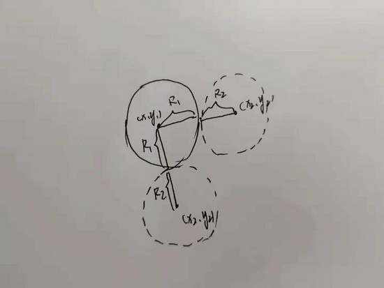 圓形間碰撞檢測(cè)可以簡(jiǎn)單地通過(guò)兩圓心間距離與兩圓半徑之和的比較做判斷,當(dāng)兩圓心距離小于兩圓半徑之和時(shí)則發(fā)生碰撞。