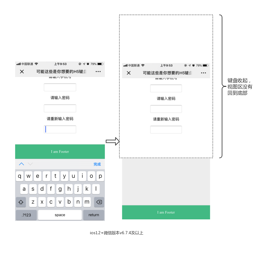 如果你在用 IOS12 和 V6.7.4+版本的微信瀏覽器打開上面表單輸入的 demo ,就會驚奇的發現鍵盤收起后,原本被滾動頂起的頁面并沒有回到底部位置,導致原來鍵盤彈起的位置“空”了。