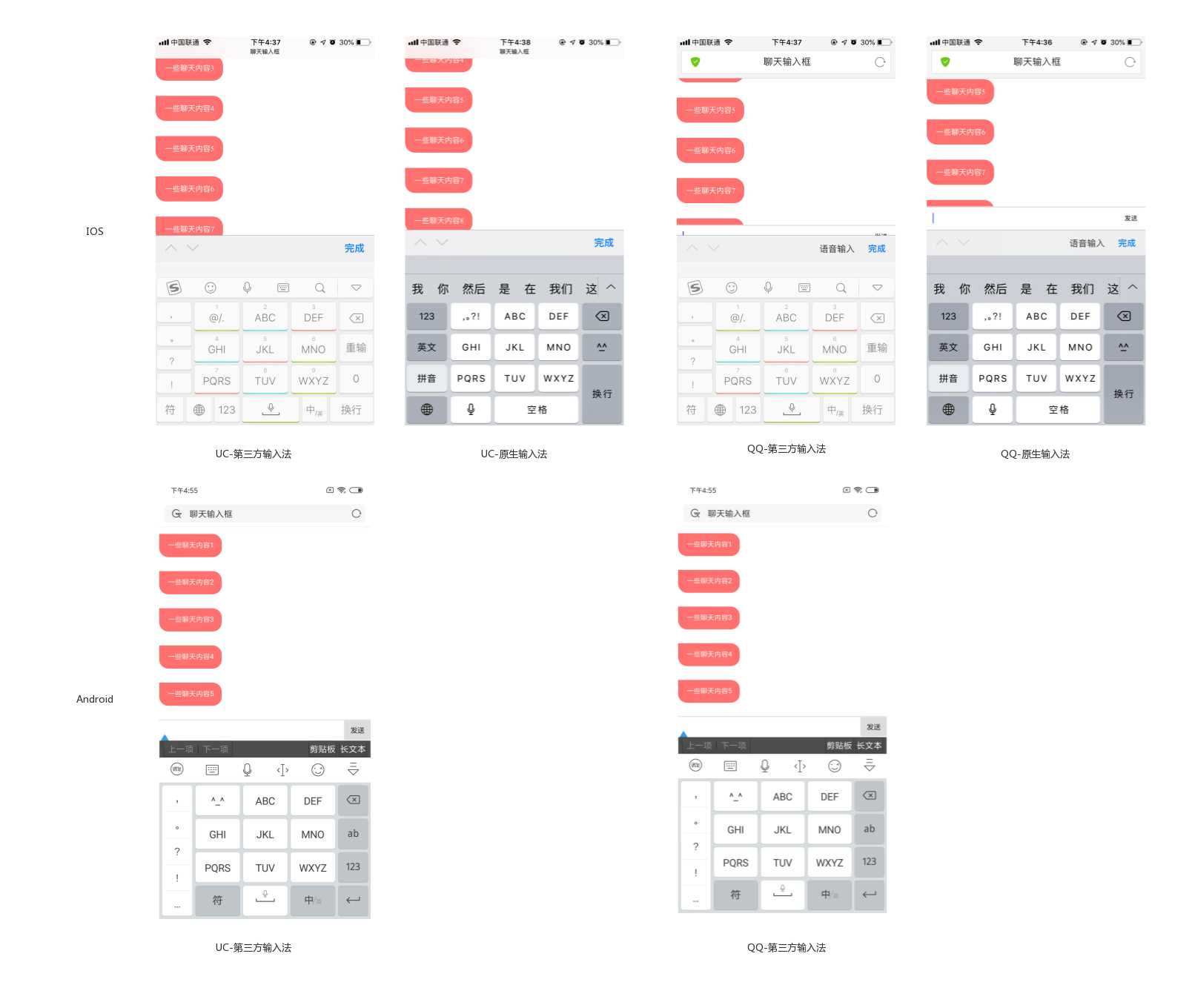 很簡單,就是劃分內容區和輸入區,輸入區是絕對定位,按照上面表單輸入 demo 的做法,確實大部分 Android 瀏覽器是沒問題的,但是測試在 IOS 上,UC 瀏覽器配合原生輸入法和第三方輸入法(比如搜狗輸入法),輸入框都會被完全擋住;QQ 瀏覽器或微信瀏覽器,配合第三方輸入法,輸入框會被遮住一半;百度瀏覽器配合第三方輸入法輸入框也會被完全遮住。查看效果可以用相應瀏覽器中訪問這里。