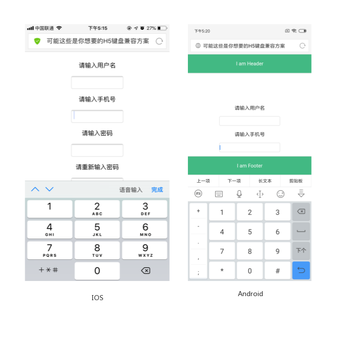 獲知軟鍵盤的彈起還是收起狀態很重要,后面的兼容處理都要以此為前提。然而,H5 并沒有直接監聽軟鍵盤的原生事件,只能通過軟鍵盤彈起或收起,引發頁面其他方面的表現間接監聽,曲線救國。并且,在 IOS 和 Android 上的表現不盡相同。