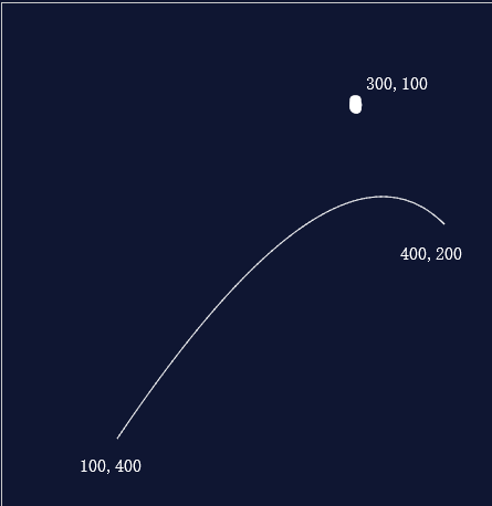 /** * 二次貝塞爾曲線動畫 * @param {Array<number>} start 起點坐標 * @param {Array<number>} 曲度點坐標(也就是轉彎的點,不是準確的坐標,只是大致的方向) * @param {Array<number>} end 終點坐標 * @param {number} percent 繪制百分比(0-100) */ function drawCurvePath(start, point, end, percent){ ctx.beginPath(); //開始畫線 ctx.moveTo(start[0], start[1]); //畫筆移動到起點 for (var t = 0; t <= percent / 100; t += 0.005) { //獲取每個時間點的坐標 var x = quadraticBezier(start[0], point[0], end[0], t); var y = quadraticBezier(start[1], point[1], end[1], t); ctx.lineTo(x, y); //畫出上個時間點到當前時間點的直線 } ctx.stroke(); //描邊 } /** * 二次貝塞爾曲線方程 * @param {Array<number>} start 起點 * @param {Array<number>} 曲度點 * @param {Array<number>} end 終點 * @param {number} 繪制進度(0-1) */ function quadraticBezier(p0, p1, p2, t) { var k = 1 - t; return k * k * p0 + 2 * (1 - t) * t * p1 + t * t * p2; }