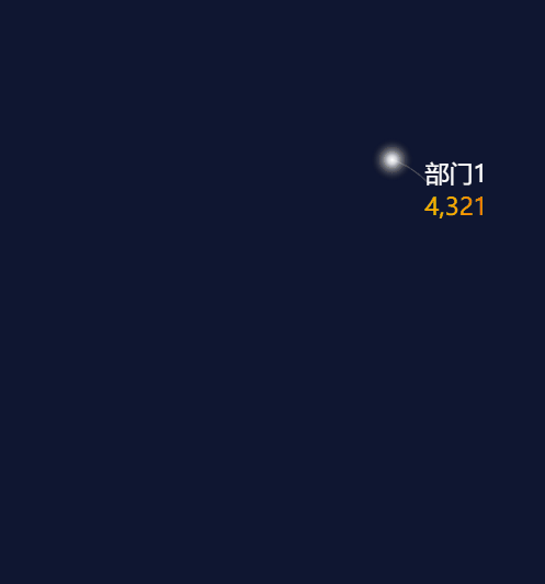 /** * 創建文本 * @param {String} 部門數據 * @param {Number} 數據 * @param {Number} x軸坐標 * @param {Number} y軸坐標 */function drawText(department, value, x, y) { ctx.fillStyle = '#fff' ctx.font = "22px 微軟雅黑"; ctx.fillText(department, x + 30, y + 20); //為了使文本在光暈右下角x,y軸需要偏移一些距離 var width = ctx.measureText(value).width; //獲取文本的寬度 ctx.fillStyle = createLinearGradient([x + 30, 0], //文本漸變x軸的渲染范圍是[x+30,x+30+文本的寬度], [x + 30 + width, 0], //這里y取0,是因為沒找到獲取文本高的api,寫0也是可以的 '#fffd00', '#ff6d00' ); ctx.fillText(value.toLocaleString(), x + 30, y + 50); } //drawCurvePath函數需要做些調整 function drawCurvePath(start, point, end, percent, department, value) { //... createHeadLight(x,y) drawText(department, value, x, y) }