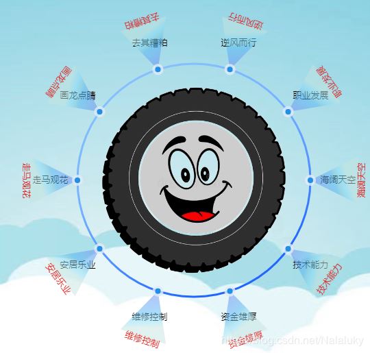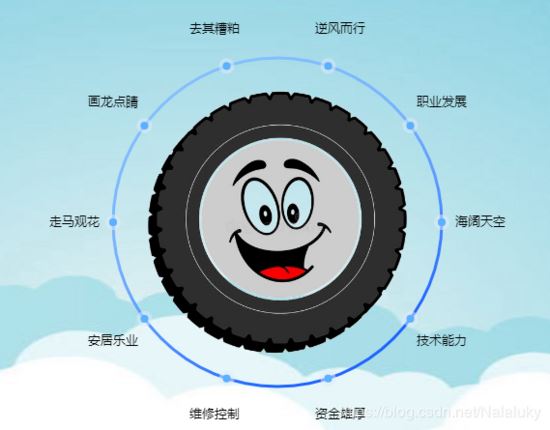 最近筆者有個需求,需求內容為:一組文字顯示在圓環的周圍,用戶可添加文字,文字圍繞著圓環,每個詞對應圓環周圍的的藍色小圓點,當用戶鼠標放在圓環上方小藍點時時,實現放射出三角形,再顯示出文字,先看看動圖效果吧!
