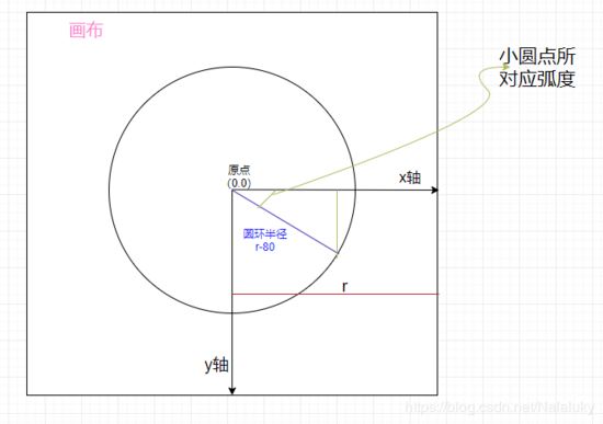 其中弧度,小圓點,圓環,圓環半徑,畫布原點關系,筆者畫了一個圖來描述它們。