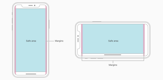 安全區域指的是一個可視窗口范圍,處于安全區域的內容不受圓角(corners)、齊劉海(sensor housing)、小黑條(Home Indicator)影響,如下圖所示: