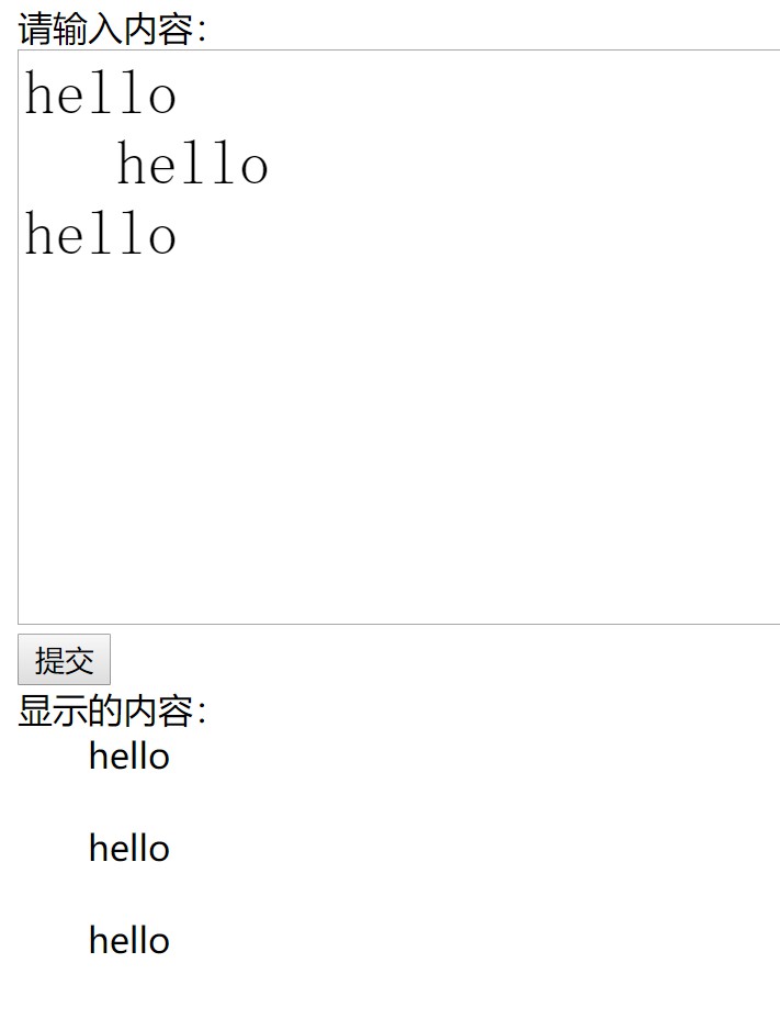 <div id="app"> <p>請輸入內容:</p> <textarea name="t1" rows="8" cols="80" v-model="text1" ></textarea> <button @click="submitText">提交</button> <p>顯示的內容:</p> <div v-html="text2" style="text-indent:2em;"></div></div>// js部分submitText(){ let arr = []; this.text1.split('/n').forEach(item=>arr.push(`<p>${item.trim()}</p>`)); this.text2 = arr.join('<br>');}
