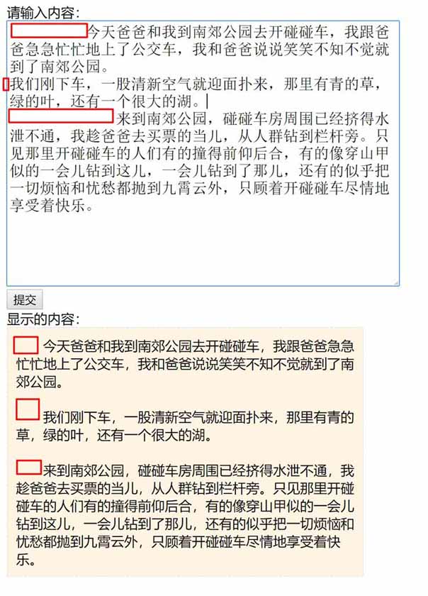 可以從下圖的效果看出,pre 標簽也可以完全實現保留用戶所輸入的空格和換行,看上去似乎能夠達到我的基本需求了。那么接下來的問題就是,如何去掉空格,并且實現自動縮進2個字符。